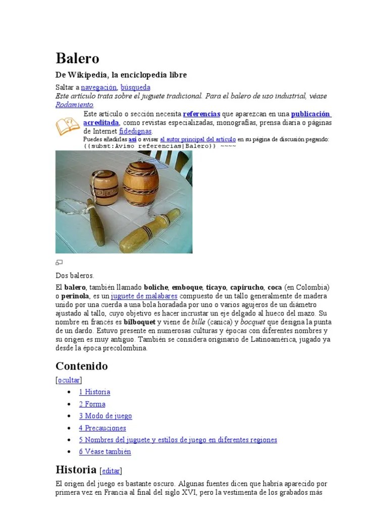 Existen varios juegos con las bolas como son la. Balero · varios nombres · el juego en diferentes países · origen · forma · instrucciones · precauciones · véase también · referencias .